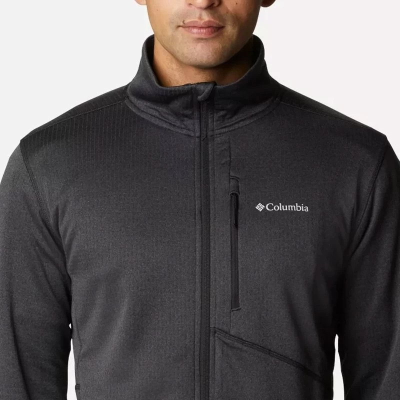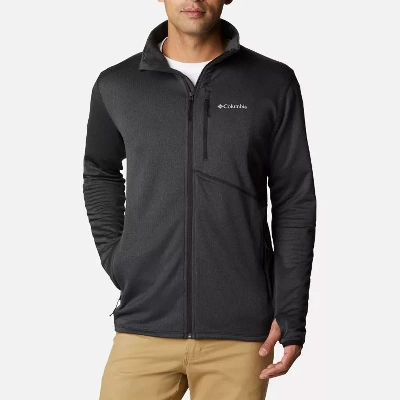 The zippered silhouette features a chin guard and long sleeves finished with thumb holes for extra protection.