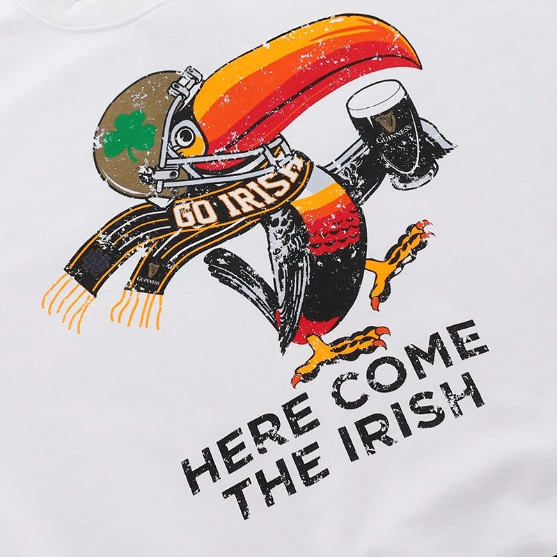 Cheer on the Fighting Irish with the Guinness Notre Dame Sweatshirt, featuring the Guinness toucan with a football helmet and ‘Here Come The Irish’ text printed on the front.