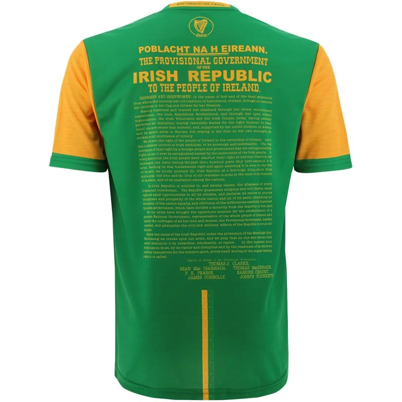 The Meath 1916 jersey is a unique Irish heritage gift. The jersey is made from high performance Koolite fabric that transports moisture away from the skin. The jersey features a reproduction of the 1916 Proclamation, water marked harp detail, an embroidered harp and “Éirà Amach na Casca” text across the back of the neck.