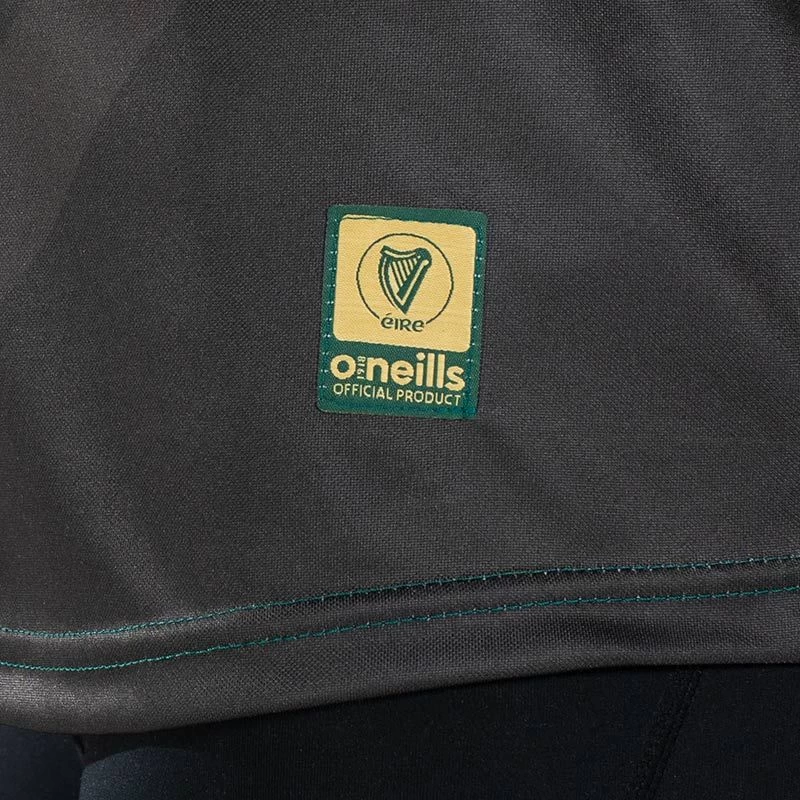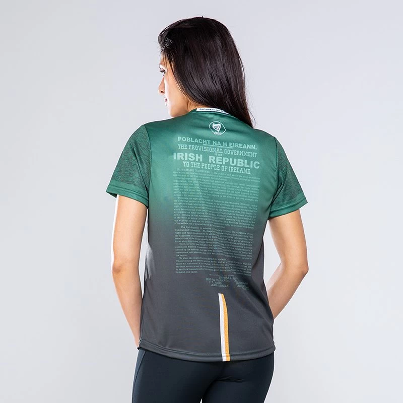 New 1916 commemoration jersey is styled in a brilliant deep green colour with white and gold twin stripe Celtic knot detail across the upper chest, finished with a rich gold embroidered Éire harp crest, Éirà Amach na Cásca text and watermarked harp design. The back of the jersey features the historic Poblacht na hÉireann.