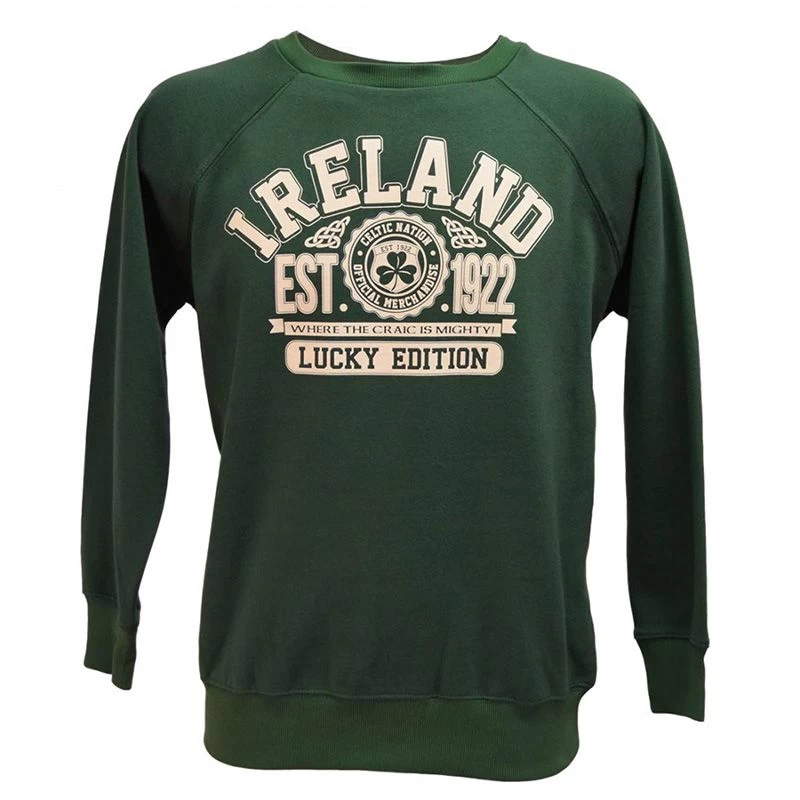 This bottle green unisex sweatshirt is a part of the Traditional Craft Official Collection. It is a relaxed fit and features a printed Ireland logo with a “Celtic Nation” crest and small Celtic designs above the year the Republic was founded.