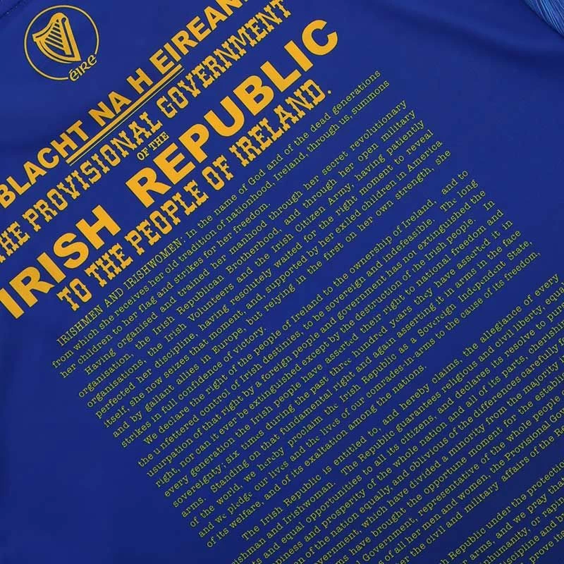 The Tipperary 1916 jersey is a unique Irish heritage gift. The jersey is made from high performance Koolite fabric that transports moisture away from the skin. The jersey features a reproduction of the 1916 Proclamation, water marked harp detail, an embroidered harp and “Éirà Amach na Casca” text across the back of the neck.